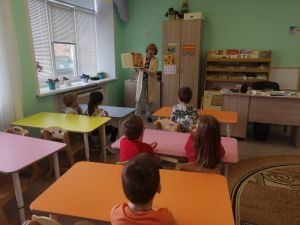 Бөек Җиңү бәйрәме алдыннан, Түбән Ослан балалар бакчасында төрле яшьтәге өлкән төркемдә тәрбияләнүчеләргә китапханә хезмәткәре Нина Викторовна кунакка килде.