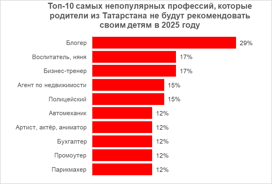 Среди профессий, которые родители категорически не хотят видеть в карьере своих детей, лидирует профессия блогеров (29%). Это связано с высокой степенью неопределенности и рисков, присущих данному направлению. Следующими идут такие профессии, как воспитатели/няни (17%), бизнес-тренеры (17%), агенты по недвижимости (15%) и полицейские (15%).